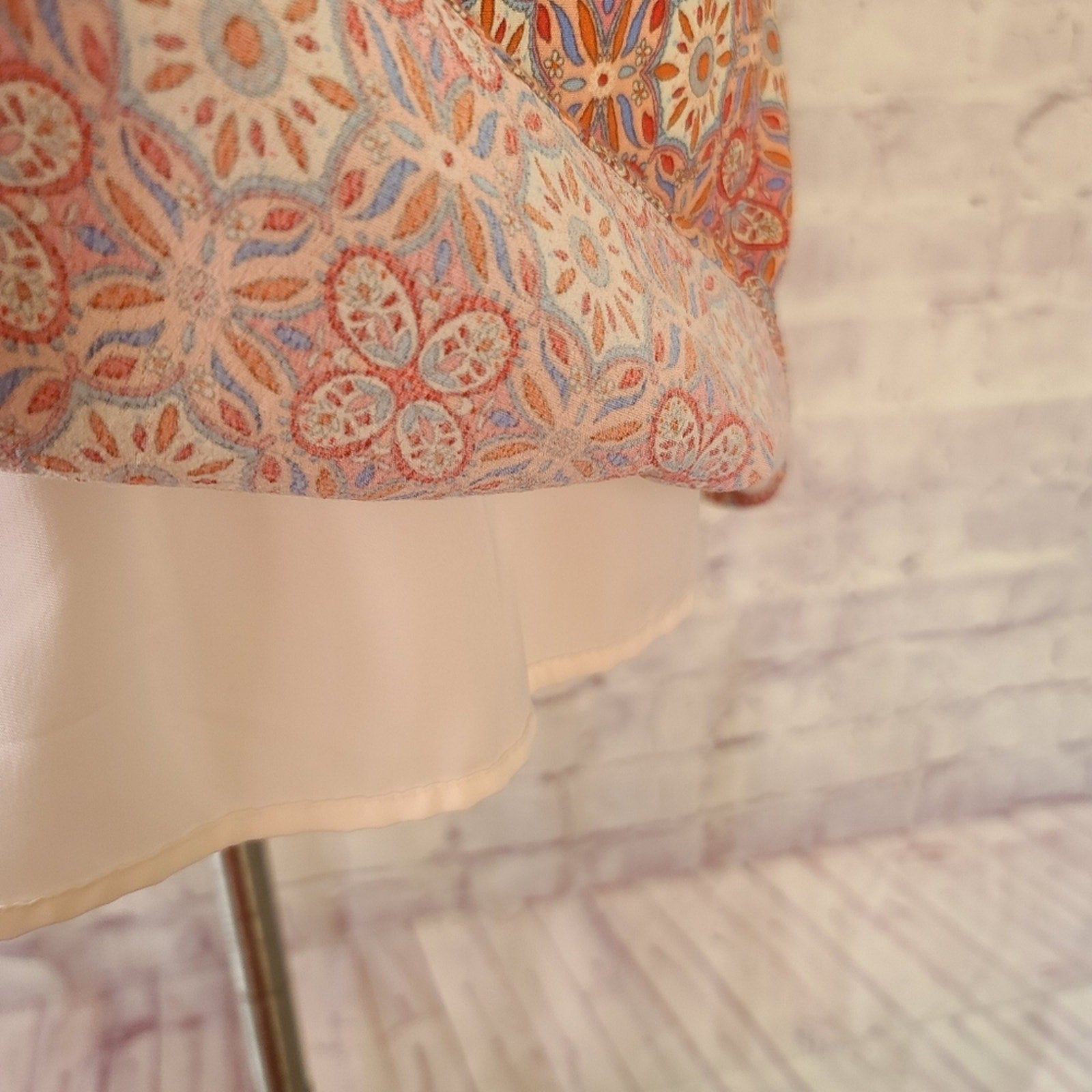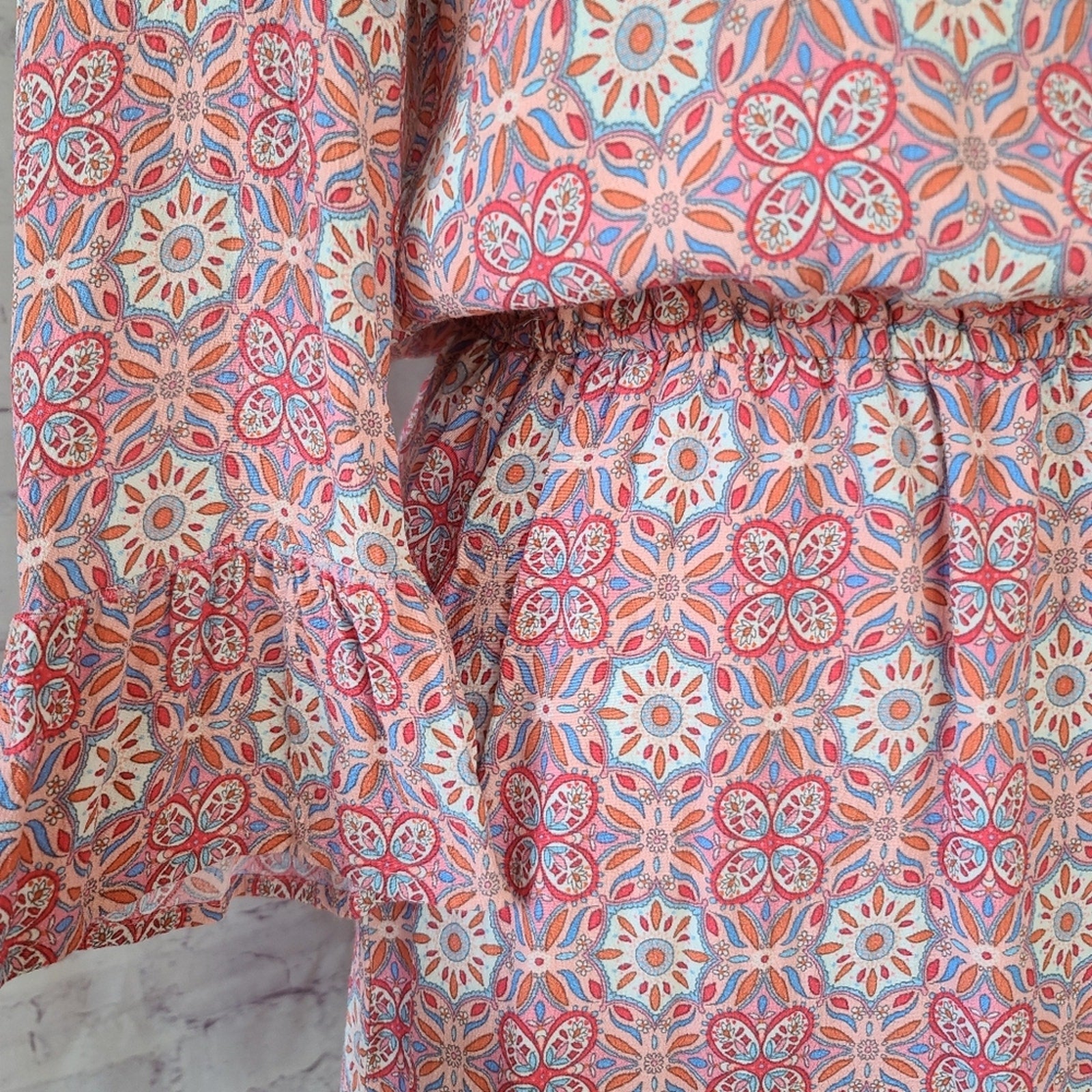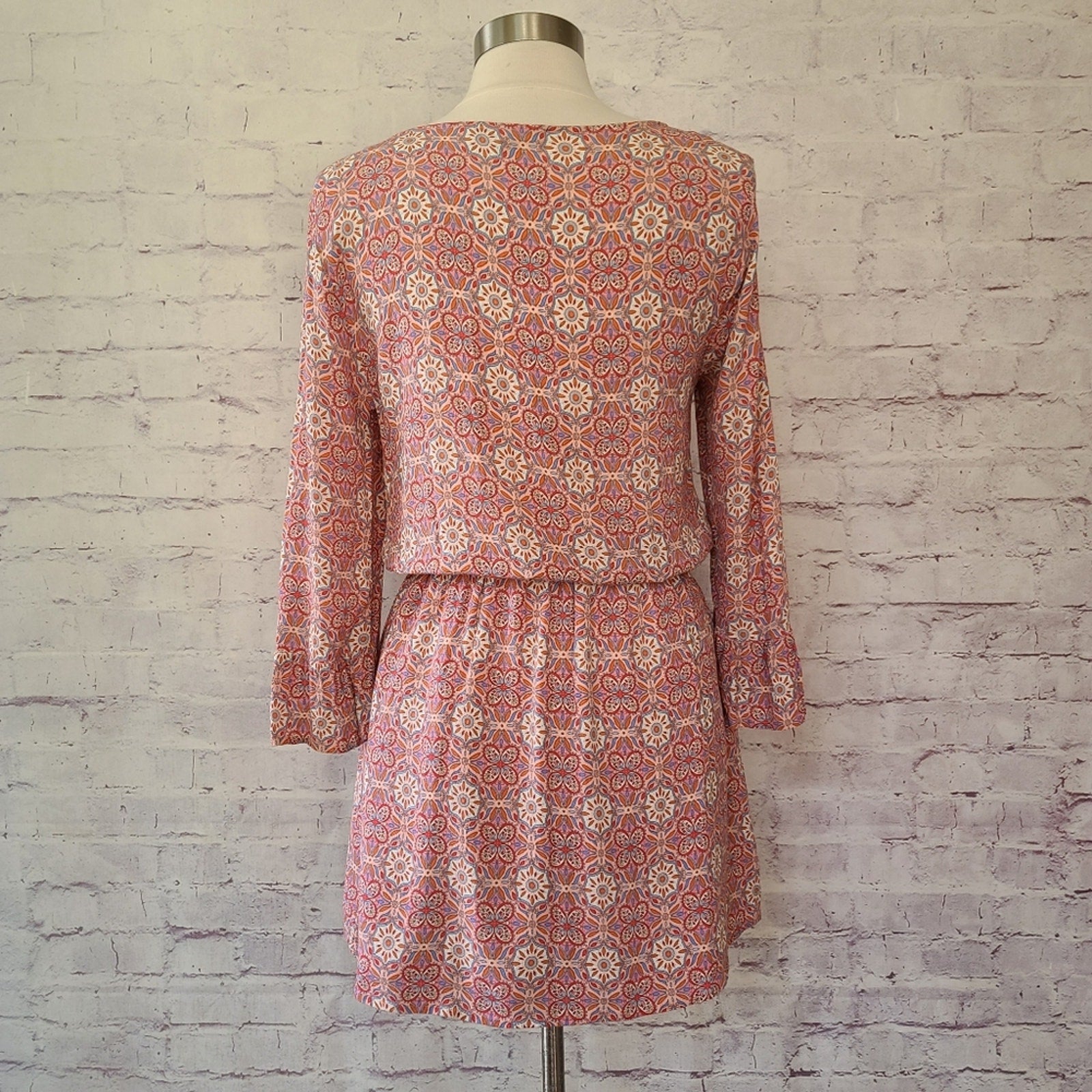 Sanctuary Pink Floral Mosaic Print Long Bell Sleeve Lace-Up V-Neck Dress Medium